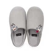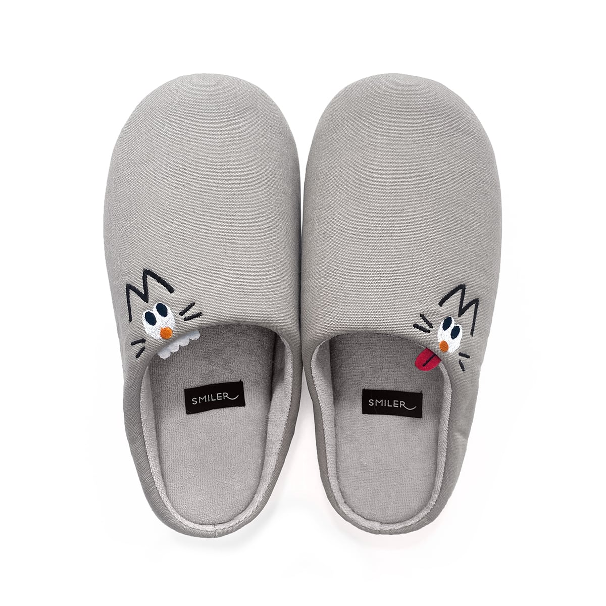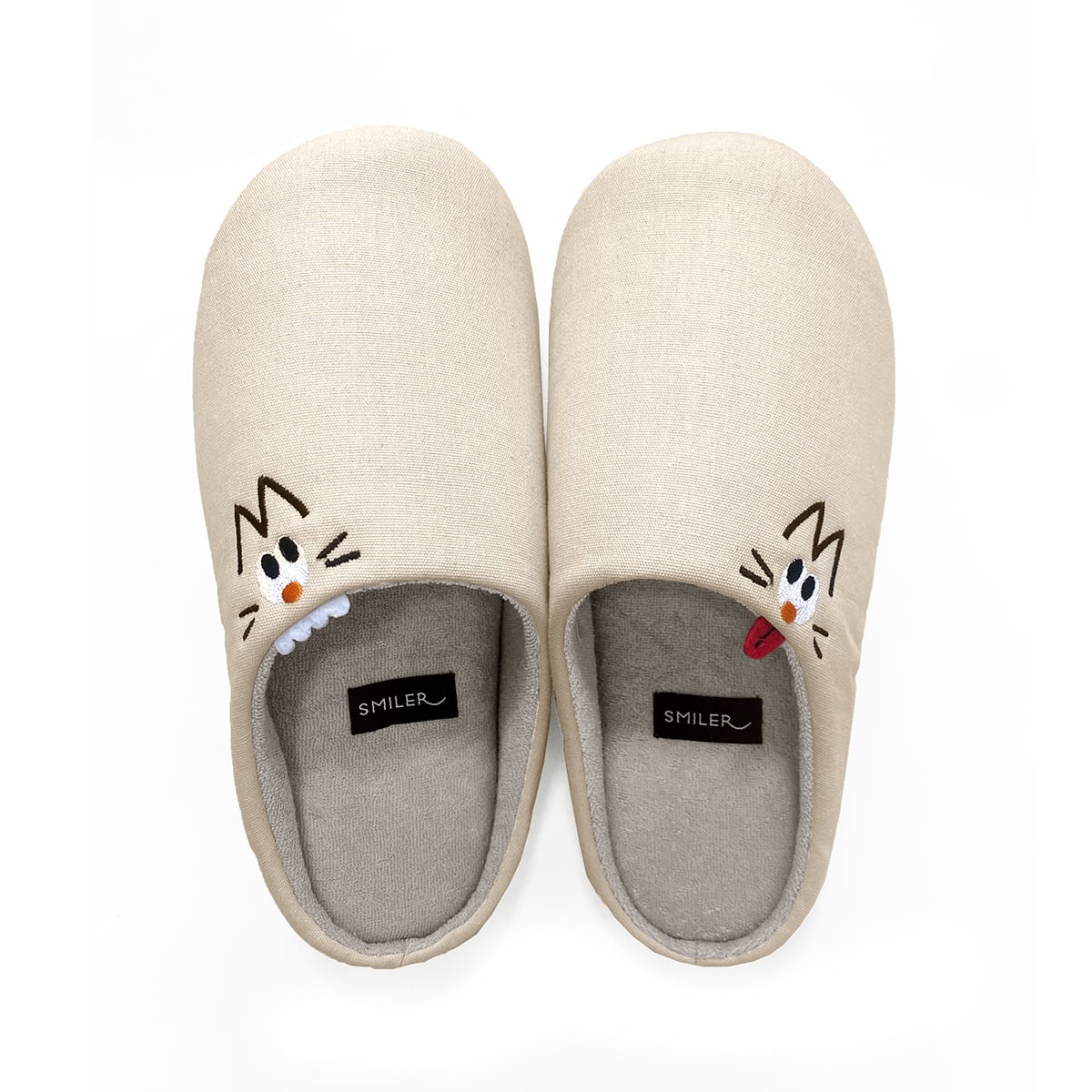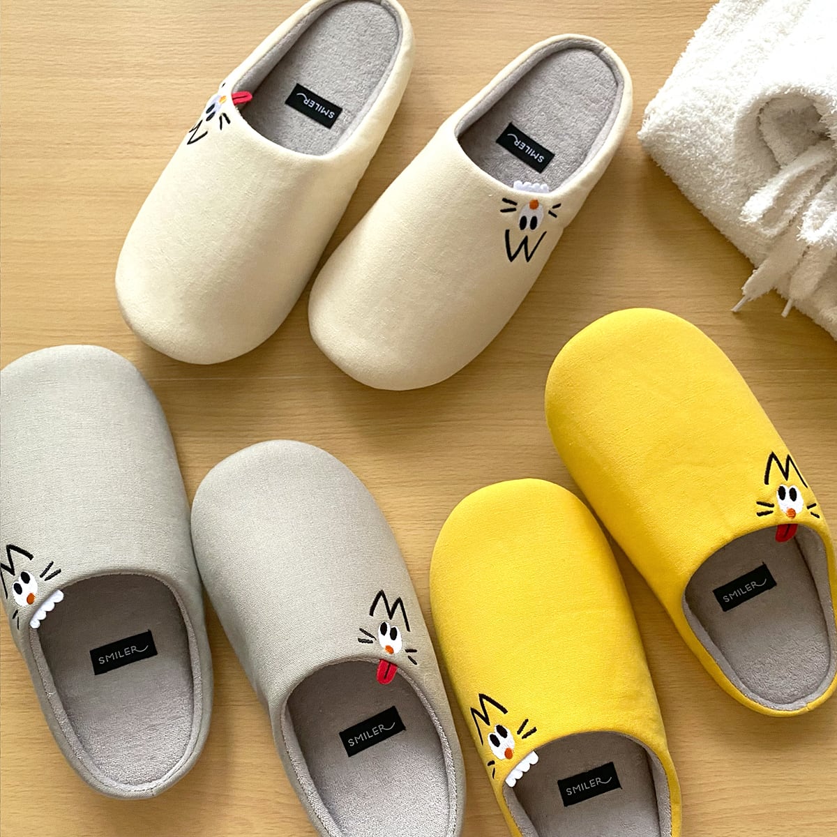 お家の中でも楽しい一時を演出するこのルームシューズは、左右非対称の猫モチーフが魅力的な一品です。